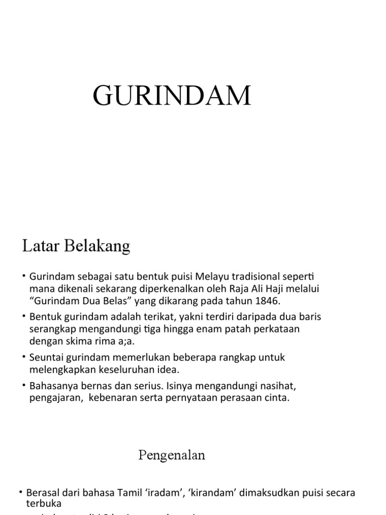 Gurindam Bentuk Terikat Dua baris yang berpasangan dan berima. Melayu bangsaku pembela bangsa tidak rela ketuanan binasa. Gurindam juga merupakan bagian dari kekayaan sastra bahasa yang dibawa.